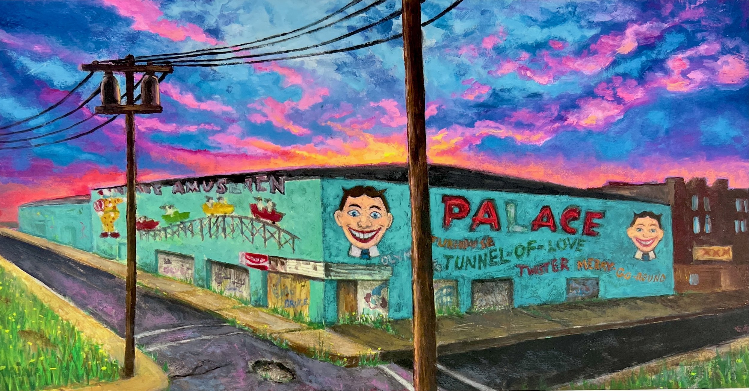 The Asbury Park Art Factory is artist Frankie Mainieri. Frankie lives in Ocean, NJ where he also maintains his art studio. In addition to making paintings and linocuts for over 40 years Frankie has had a very curious history of jobs: HS art teacher,“ghost” colorist for Archie Comics, decorative painter at Marlboro Psychiatric Hospital, in-house portrait painter for an event planner, short order cook, and night-shift UPS worker just to name a few. Currently he works for himself as a full-time artist. Frankie has shown his paintings in galleries in Philadelphia, NY, Asbury Park, and Jersey City. Frankie’s love and fascination with Asbury Park began in the 1960s when he was 3; his parents would take him and his sister Michele there frequently to enjoy the kiddie rides and games. He grew up in the adjoining town of Wanamassa only minutes away from AP by bicycle. His favorite place was the Palace which was the original home of the now ubiquitous Tillie. The Palace is now sadly a parking lot. Throughout it’s transformative history Frankie has continued to enjoy the storied city by the sea.Today he visits mostly to enjoy its art, food, and music. Some of favorite acts he has seen there include Lou Reed, The Meat Puppets, Cake, the Dandy Warhols, and Bob Dylan.